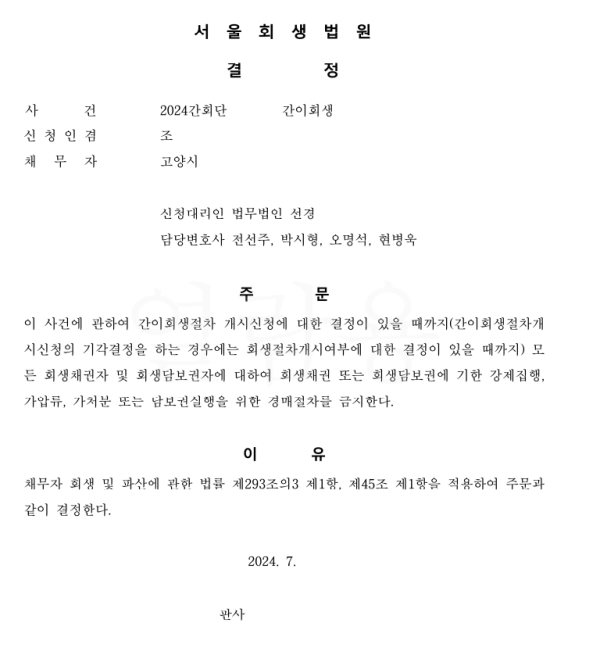 서울회생법원 일반회생 신청사건의 포괄적금지명령결정문