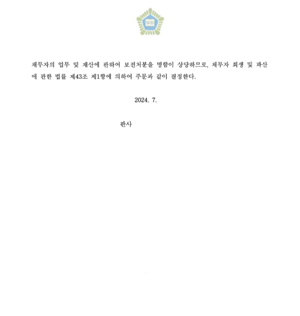 서울회생법원 일반회생 신청사건의 보전처분결정문